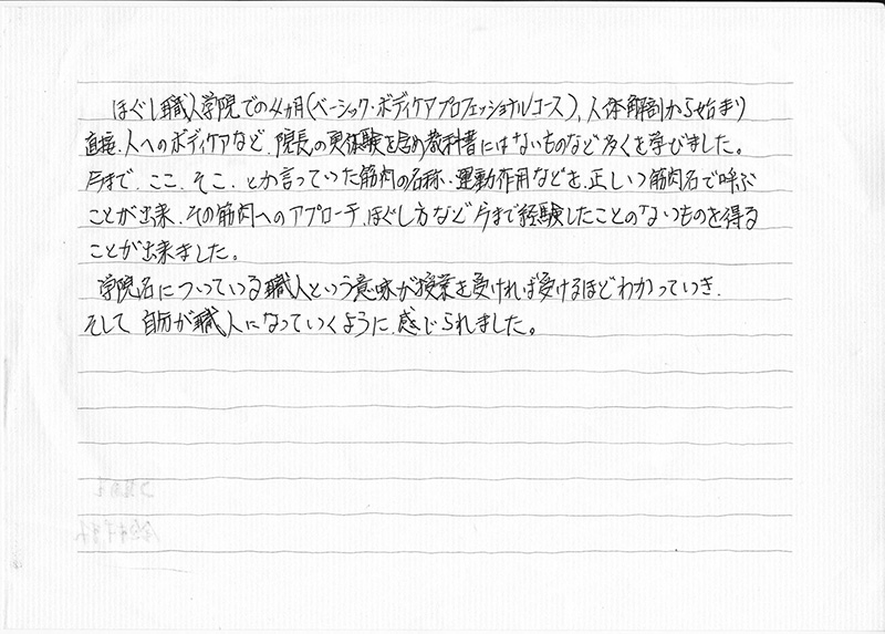 体験講座では、私の悩みをよく答えてくれとてもいい印象を受けて、今後の目標や方向性なども教えてくださるので、入校するにはあまり時間がかかりませんでした。当時は、ほぐし職人学院が千葉にあったときです。