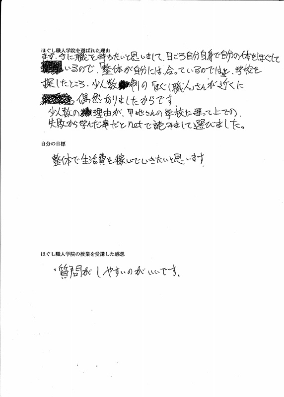 手に職を持ちたいと思いまして、日ごろ自分自身で自分の体をほぐしているので、「整体が自分には、合っているのでは。」と学校を探したところ、少人数制の「ほぐし職人」さんが近くに偶然ありましたからです。