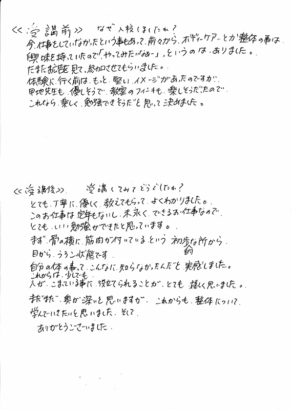 毎回、授業に参加すると甲地先生からアドバイスを受けることで気がつくことがあって楽しかったです。例えば、実技で出来ない事があってそのままやっていると、甲地先生はそこを何も言わなくてもアドバイスをくれます。その通りに行うと、これが出来てしまうんです!もうビックリします。卒業して現場で大いに、学んだことを使わせていただいております。お客様からの反応も上々で自分に自信がつきましたし、すごく指名のお客さまも増えたんです。整体学校ってお金もかかるし、通う時間もかかるのですが、自分のために使うことはそんではありませんね。十分に色々と教えていただきましたが、これからも分からないことなどあれば甲地先生にお世話になります。セラピストとしてのお仕事を楽しくしてくださった甲地先生受講生の皆さんに感謝します。