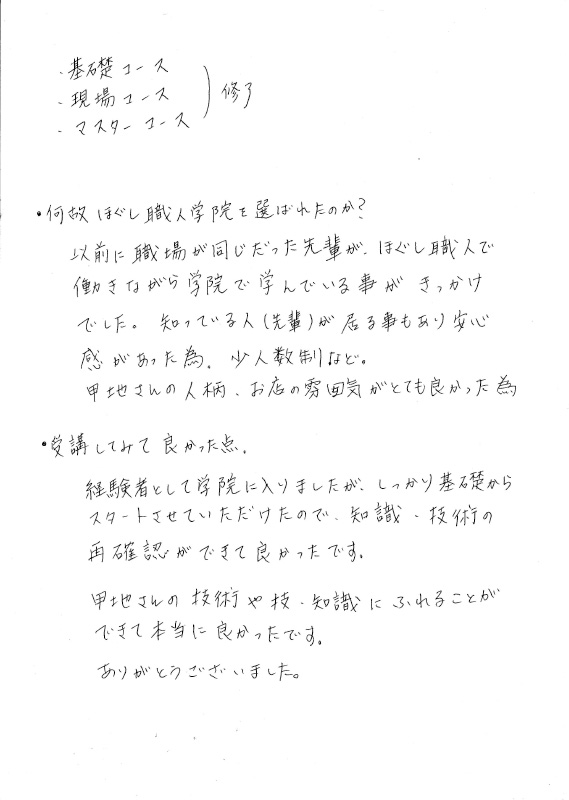 整体やリラクゼーションサロンに勤務していて、私は経験者として、整体学校を探していて、その中からほぐし職人学院に入校しました。現場に出て、色々と不安なことが沢山ありまして、「これではいかん!」と思ってたところ、甲地先生に出会いまして、整体学校への入校を決めました。授業では、とても分かりやすい授業でした。理論的に進めてくれるから納得の授業です。